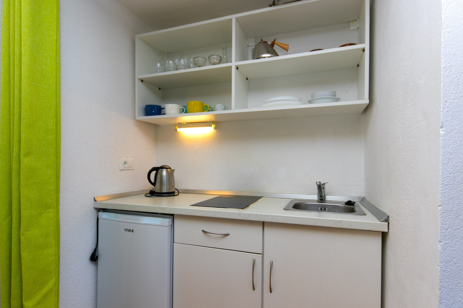 Najbliži plaži s vlastitom terasom okrenutom prema moru i dnevnim boravkom, studio sadrži king size krevet i kauč, kuhinjsku nišu i vlastitu kupaonicu.